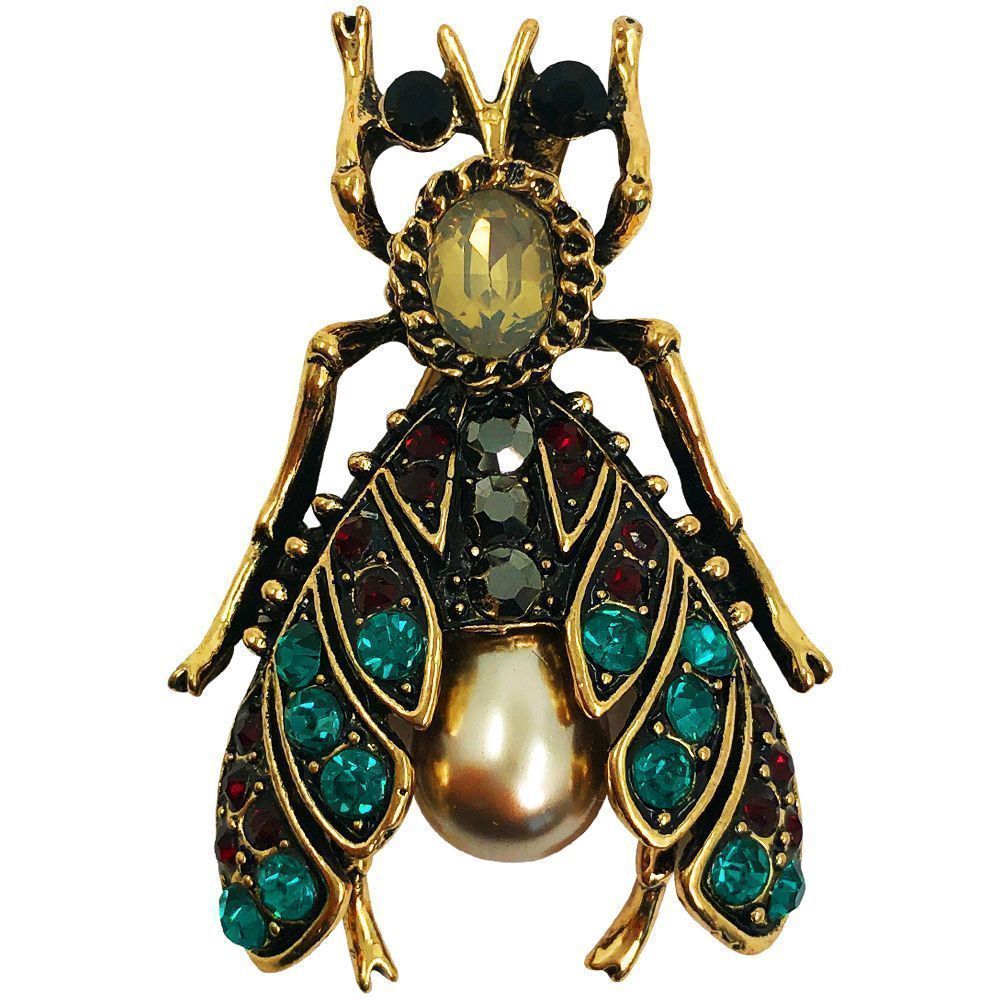 Жемчужина на туловище мухи, крупный камень на грудке, черные глазки-камешки, разноцветные крылья.