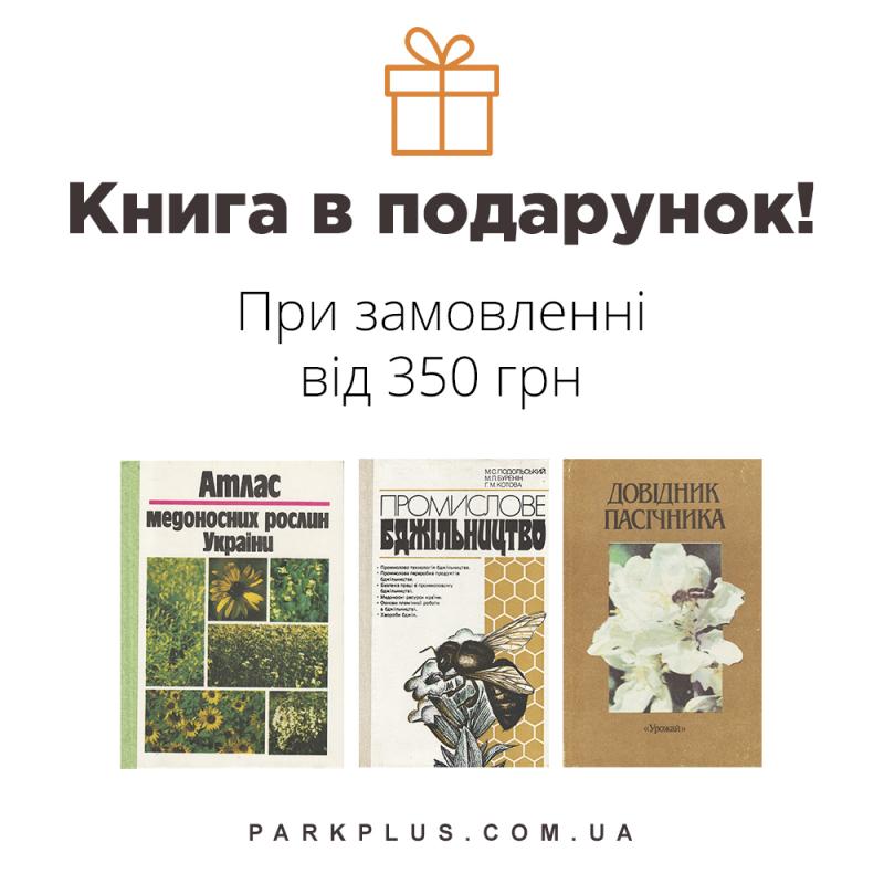 Миссией компании Парк Плюс является способствование развитию пчеловодства в Украине. Для этого мы проводим акцию, которая нацелена на повышение профессиональной грамотности при занятии пчеловодством. Покупатель совершивший покупку от 350 гривен получает в подарок одну из трёх книг на выбор: