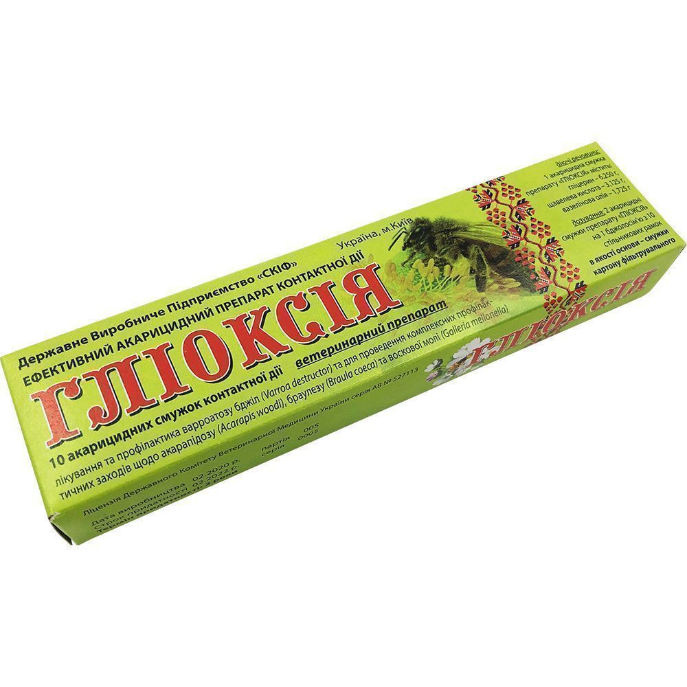 Глиоксия – это ветеринарный препарат предназначенный в основном для борьбы с проявлениями клещевых заболеваний у пчёл, а также для лечения акарапидоза, браулеза и восковой моли. Препарат Глиоксия основан на безопасных для здоровья пчел и человека компонентах – глицерине и щавелевой кислоте. Образцы меда отобранные у пчелиных семей обработанных препаратом Глиоксия после анализов показали, что его применение не вызывает накопление в меде и сотах вредных веществ, поэтому его разрешено применять на протяжении всего активного периода, без ограничений на период главного медосбора. Длительное применение полосок Глиоксия не вызывает привыкания и появления популяций паразитов устойчивых к компонентам препарата. Препарат будет интересен для применения всем пчеловодам, которые интересуются получением меда высокого качества, пригодным для продажи потребителям с высокими требованиями к составу меда и его происхождению (например страны Европейского Союза, люди ведущие здоровый образ жизни).