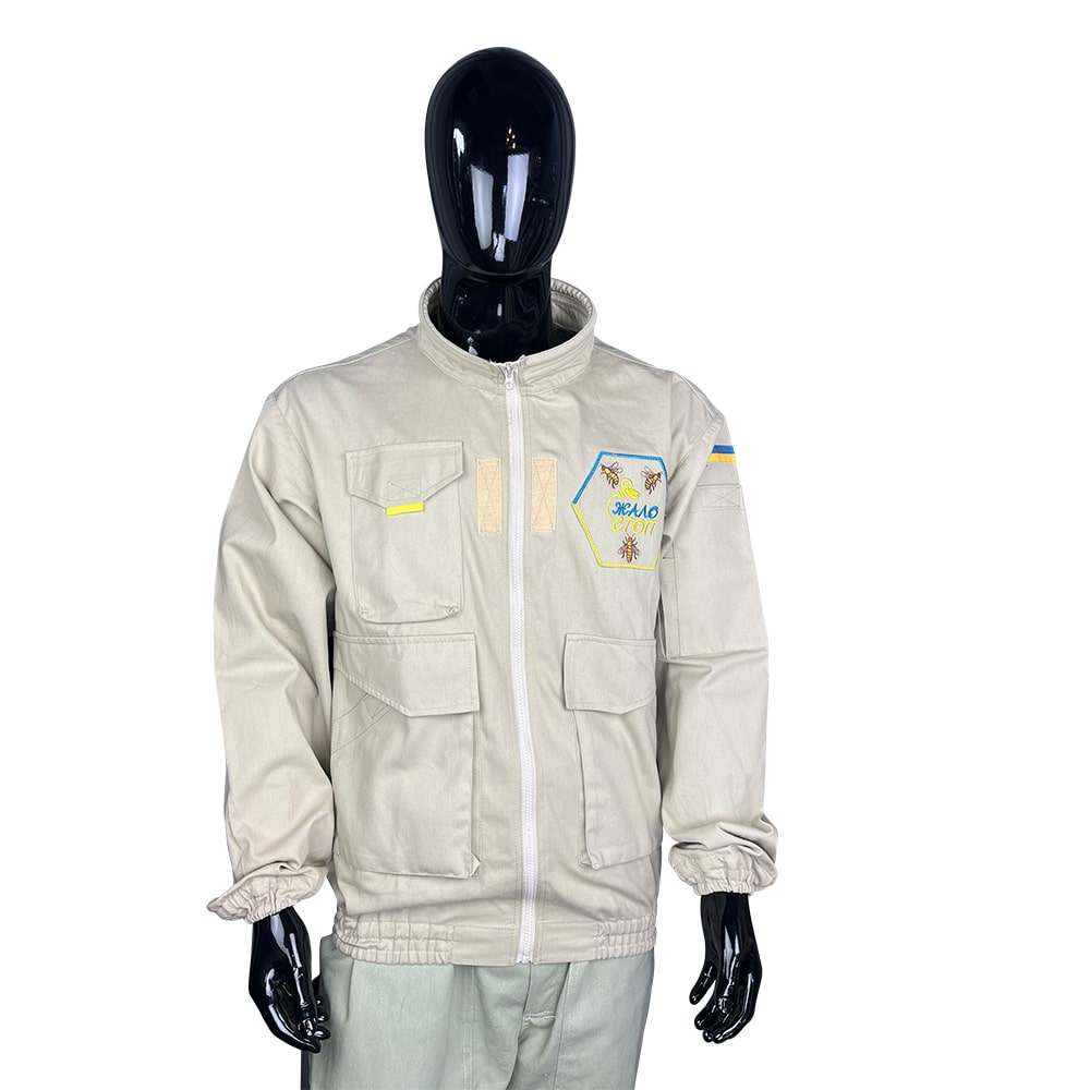 Куртка пчеловода на застежке-молнии со съемной маской. Куртка выполнена из натуральной ткани - саржи. Имеет два передних кармана, один нагрудный и один на рукаве. Маска съемная и крепится к куртке с помощью клапана на липучке. Низ куртки и рукавов имеет плотные резинки, что б пчела не пролезла под куртку. Для фиксации рукавов имеется резинка-фиксатор на большой палец руки.Таблиця размеров
