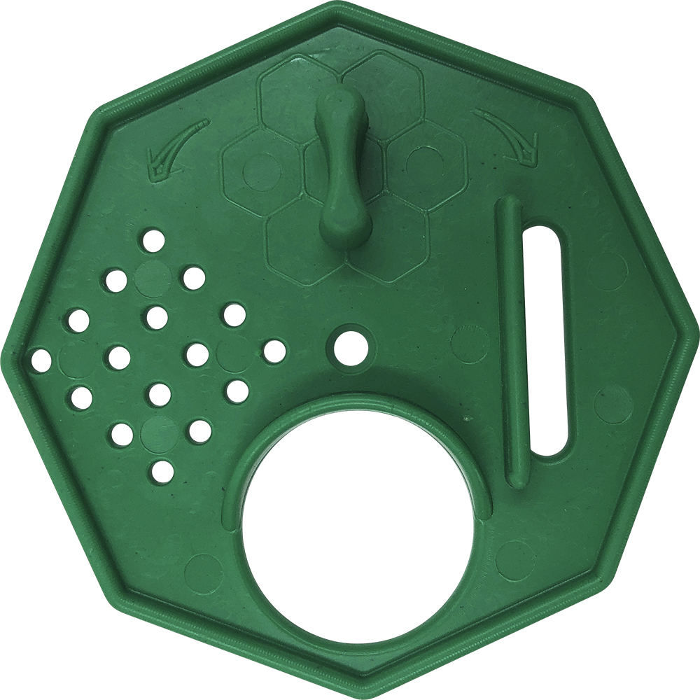 Пластиковый восьмиугольный летковый заградитель от турецкой компании HappyBees изготовлен из качественного пластика, который не трескается, не гнется, не ломается на морозе. Летковый заградитель крепится к летку с помощью гвоздя или самореза через отверстие в центре. Применяется для регулировки размеров верхнего круглого ульевого летка, либо его закрытия при погрузке и последующей транспортировке улья. Также препятствует проникновению в улей мышей, вредителей и пчел-воровок.