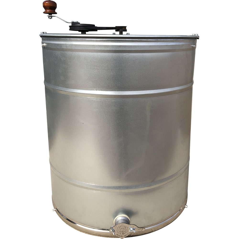 Медогонка предназначена для откачки рамок хордиальным способом, вмещает 4 рамки «Дадан» или 8 магазинных надставок (полурамок).Медогонка состоит из бака (корпуса), ротора - который установлен в баке, на роторе зафиксированы 4 кассеты с ручным поворотным механизмом, вращение осуществляется за счет ременного привода.