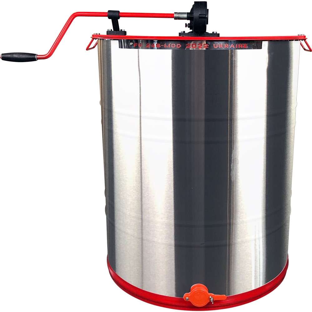 Медогонка предназначена для использования с четырьмя поворотнымирамками Дадан 300 мм или для восьми полурамок 145 мм. Изготовлена из гладкой полированной пищевой нержавеющей стали марки AISI304 толщиной 0.5 мм, которая подходит для использования в контакте с пищевыми продуктами, не выделяет вредных веществ, не ферритовая ( «не берётся» на магнит). Ротор и кассеты для установки рамок изготовлены из нержавеющей стали (прут Ø 2 и Ø 4 мм AISI 304). Редуктор изготовлен из металлической червячной передачи в пластиковом корпусе. Высота бака составляет 740 мм. Кран изготовлен из пищевого пластика.