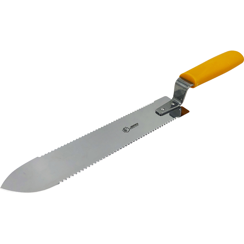 Нож для распечатывания рамок JERO с серрейторной заточкой и пластиковой ручкой производитcя португальской фирмой под торговой маркой Jero Beekeping, которая занимается выпуском различных металличеких изделий с 1983 года. Особенность и уникальные свойства ножа JERO кроется в способе заточки лезвия и специальном сплаве нержавеющей стали к которой очень плохо прилипает воск.Нож имеет двустороннюю серрейторную (волнистую) заточку, а также приподнятый носик на конце лезвия, что позволяет после основного прохода вскрыть островки с нераскрытыми крышечками. Серрейторная заточка даёт ряд преимуществ: