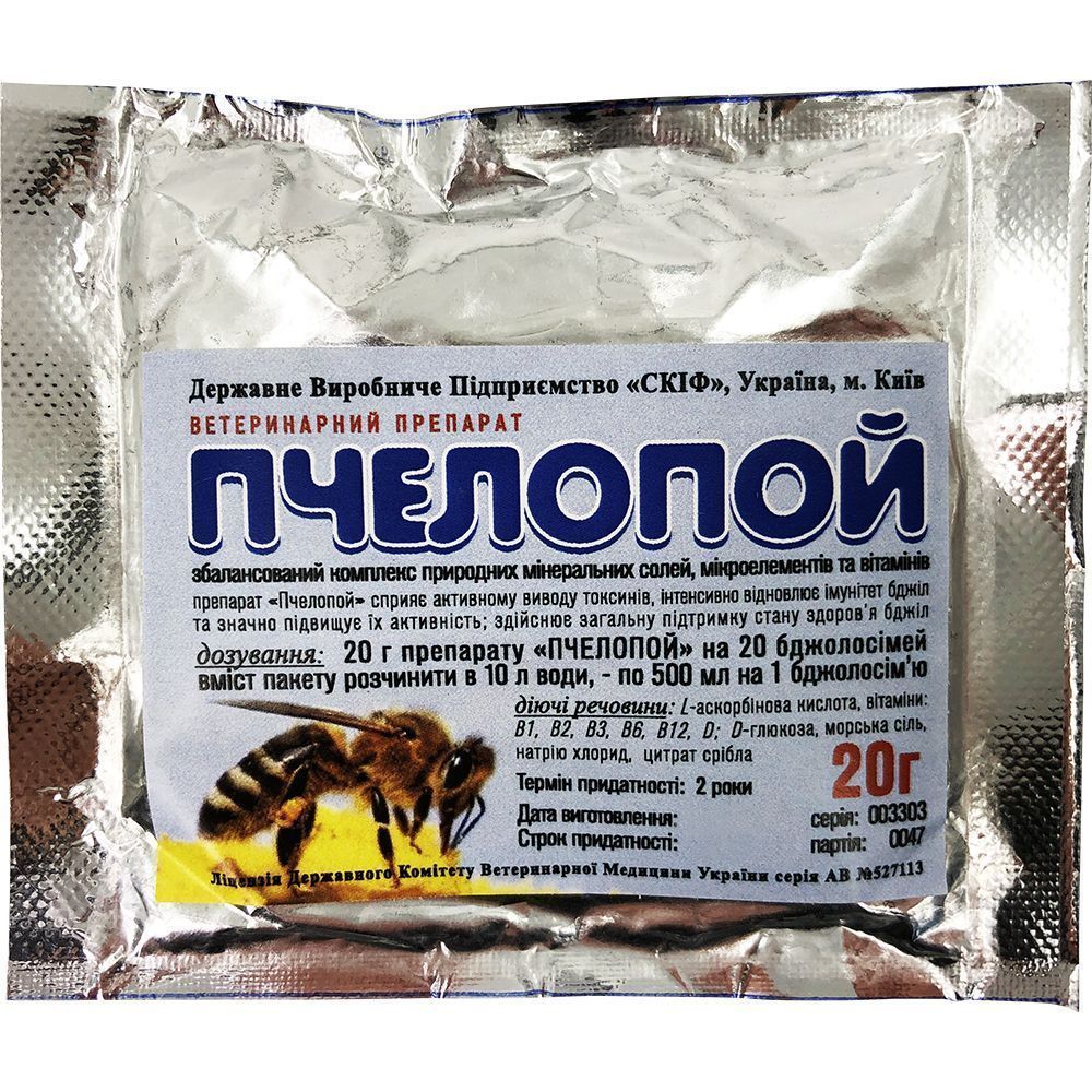 Завод-изготовитель выпускает препарат в 20g пакетиках и рекомендует сберегать ветпрепарат «Пчелопой» в заводской герметичной, фольгированной упаковке при температуре не ниже 0°С и не выше 25°С, в затемнённых местах.