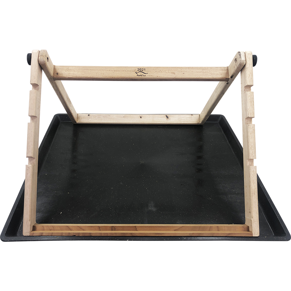 Подставка для работы с прививочной рамкой Парк Плюс выполнена из прочного дерева Нимвуд (Азадирахта индийская лат. Azadirachta indica).Она компакта и устойчива в разобранном виде. Предназначена для работы матководов во время прививки. Она может быть стационарно установлена в лаборатории у матковода или же её можно брать собой на пасеку если Вы делаете прививку непосредственно на крыше улья, например. Пазы под плечики рамки рассчитаны на три типа рамок. Дадан, Рут и 145 рамку.Для удобного раскрытия подставки в конструкции предусмотрено два винта с зажимами, которыми пчеловод может зафиксировать любой угол раскрытия. Для предотвращения полного раскрытия рамки предусмотрен страховочный шнур связывающий рамки.