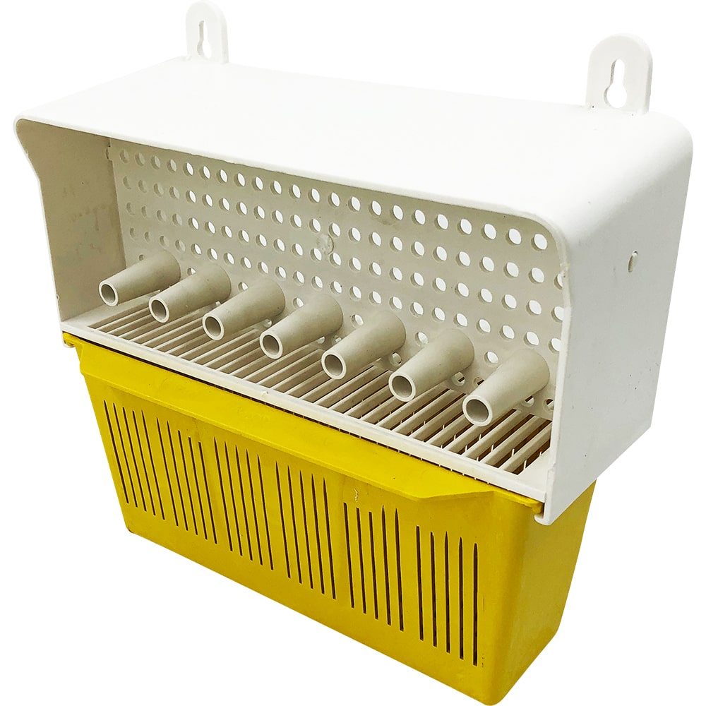 Пыльцесборник с трубочками устанавливается на леток, крепится снаружи к стенке улья. Он изготовлен из прочного пластика, в составе конструкции - две решетки, корпус, к которому они крепятся, и корзина для сбора пыльцы. Первая из решеток служит для пропуска пчел и отбора пыльцы, вторая - в качестве фильтра, отделяет корпус от корзины и препятствует попаданию мусора в отобранную пыльцу. Проходя через решетку, пчелы теряют обножку, она осыпается и накапливается в корзине. Наполнение корзины - в среднем за 1-3 дня, зависит от погодных условий.Преимущества пыльцесборников этой модели:
