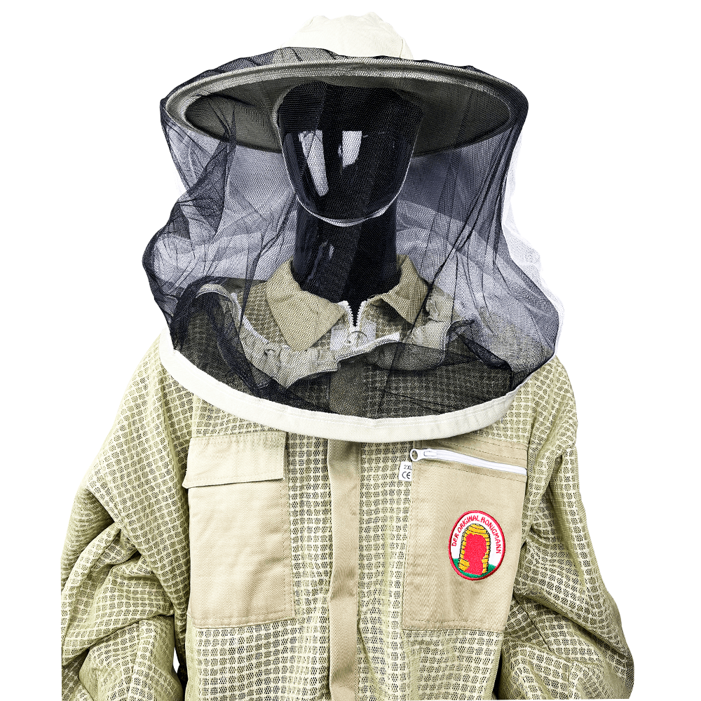 В полях шляпы вставлены металлические кольца, которые сохраняют оптимальное расстояние от края сетки до лица пчеловода: первое кольцо вшито в поля шляпы, второе - проходит с напуском почти по груди.