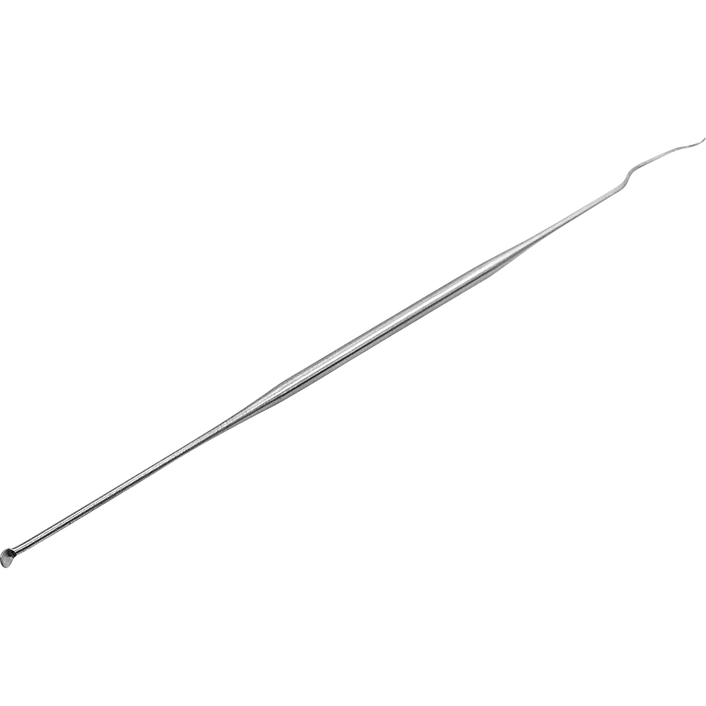 Шпатель из нержавеющей стали для переноса личинок при проведении прививочных работ на пасеке.С одной стороны шпатель имеет крючок особой формы для подхвата личинок, с другой стороны лопатка (кормовая ложечка) для кормового сока.