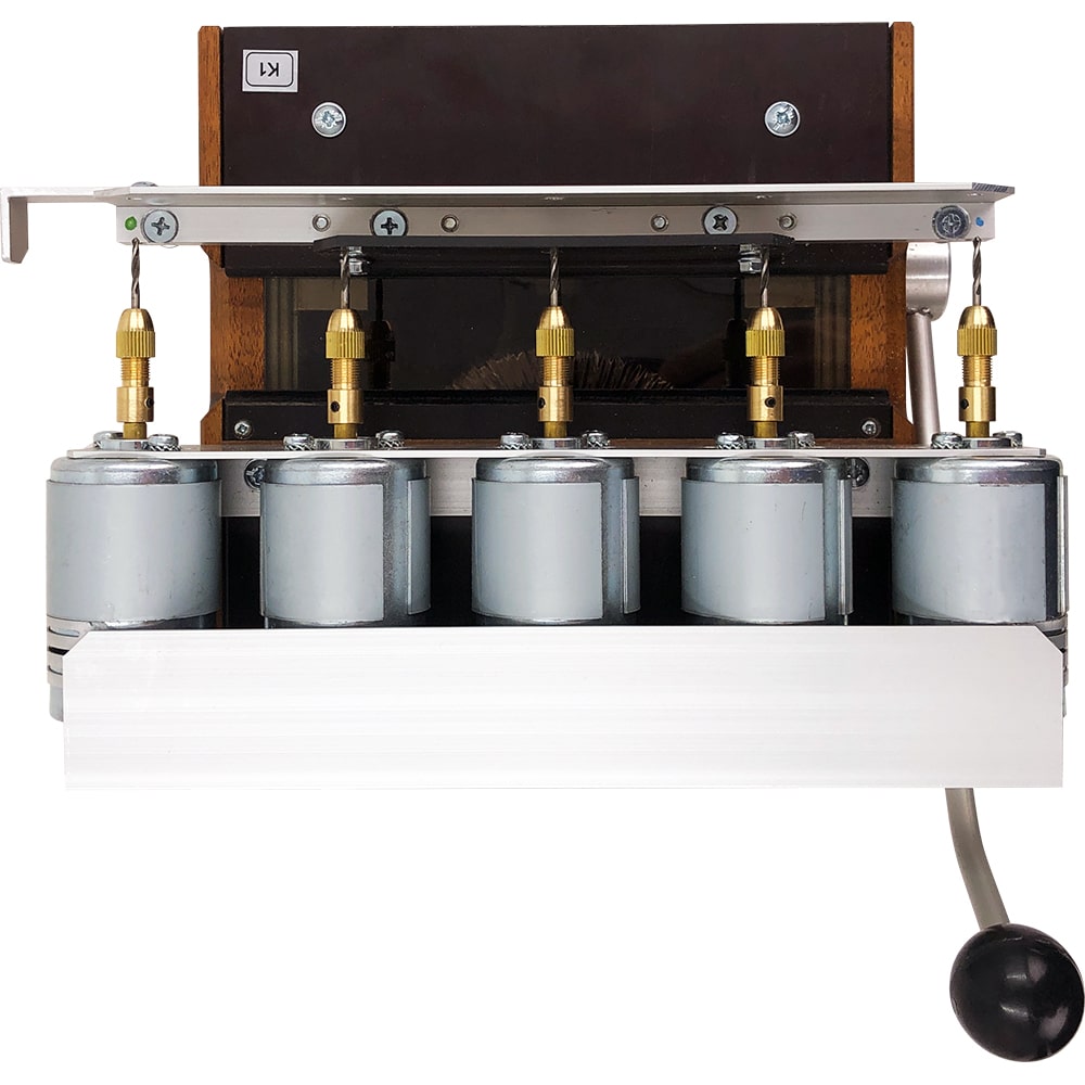 Особенность представленной модели заключается в том, что станок снабжен пятью независимыми двигателями. Мощность каждого двигателя составляет 11 Ват при общей мощности в 55 Ват. Энергопотребление во время работы станка – минимальное, станок может эксплуатироваться без перерывов на охлаждение полную рабочую смену. Так же стоит отметить низкий уровень шума во время работы устройства.
