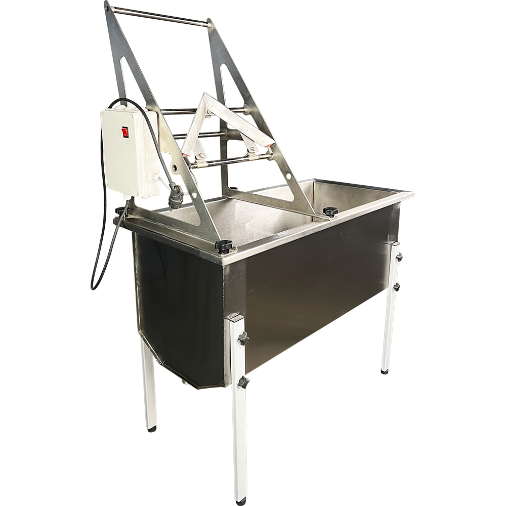 Стол для распечатывания (раскрытия) медовых рамок с вертикальным электроножом значительно ускоряет процесс подготовки к откачиванию меда. С его помощью пчеловод экономит свое время и ресурсы, максимально быстро отделяя соты от слоя забруса, и собирая подготовленные рамки в накопителе до 20 штук включительно.Устройство стола включает в себя бак-накопитель, клиновой электронож на фиксациононой стойке, фильтр для сбора забруса, и опорные ножки. Длина рабочей части стола - 1000 мм, ширина - 440 мм, высота самого стола - 850 мм, ширина бортиков 40-50 мм. Материал - нержавеющая сталь марки AISI430, толщина стенки 0,8 мм. Особенностью является матовая поверхность стали, на которой потертости не будут видны.