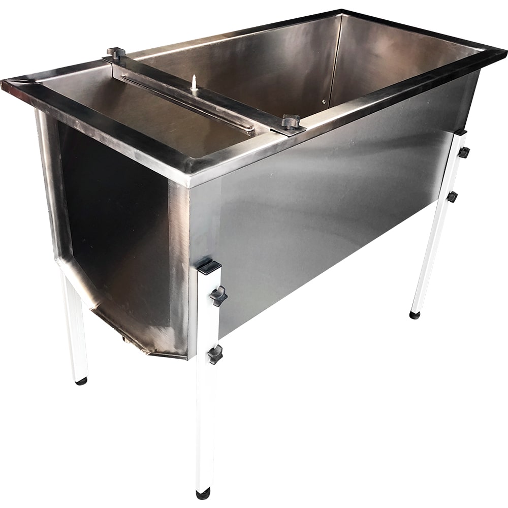 Стол для раскрытия сотовых рамок очень помогает и облегчает пчеловоду весь процесс распечатки и подготовки медовых рамок к откачке меда.Конструкция состоит из бака, фильтра для забруса (иногда его называют корзиной) и опорных ножек. Данная модель имеет длину рабочей зоны 1000 мм, ширину 440 мм. Изготовлен из нержавеющей стали AISI430 толщиной 0.8мм. Бортики имеют ширину 4-5 см. Поверхность матовая, на ней не будут видны небольшие потертости.