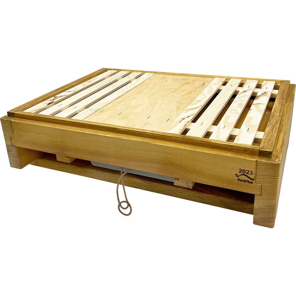 Дно також укомплектоване відкидною прилітною планкою. Її можна підняти і зафіксувати за допомогою металевого замка. Бджоли залишаються в закритому вулику, що зручно під час кочівлі або для тимчасової ізоляції сім'ї.