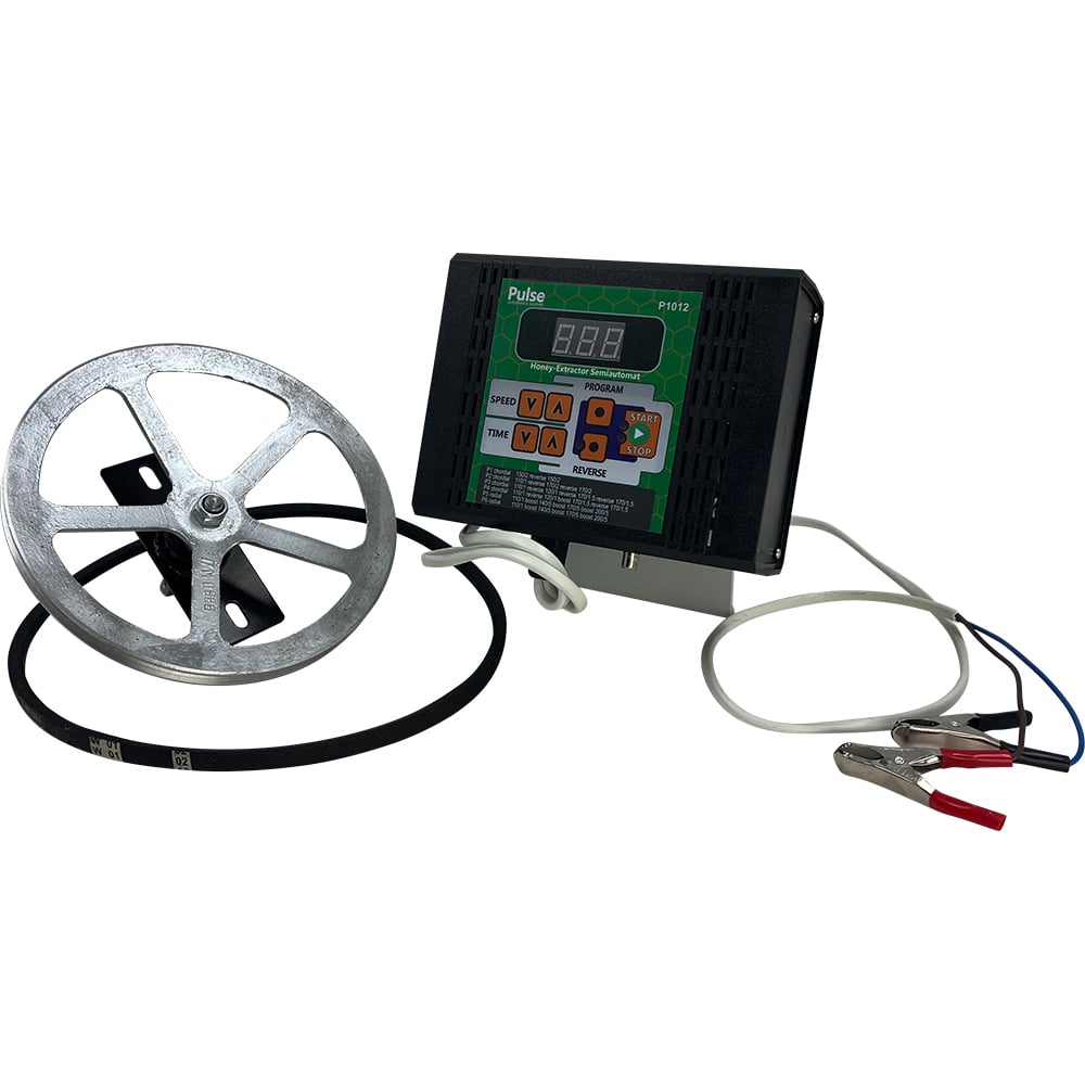Універсальний комплект електроприводу для медогонки сумісний з моделями від 3-х до 8-ми касет, а також з радіальними медогонками об'ємом до 36 рамок. Його переваги - потужний двигун, а також пульт керування на 12 Вольт, що працює від акумулятора або блоку живлення, і має готові програми для відкачування. Бджоляр може також внести корективи та змінити наявну програму під параметри, зручні саме йому.