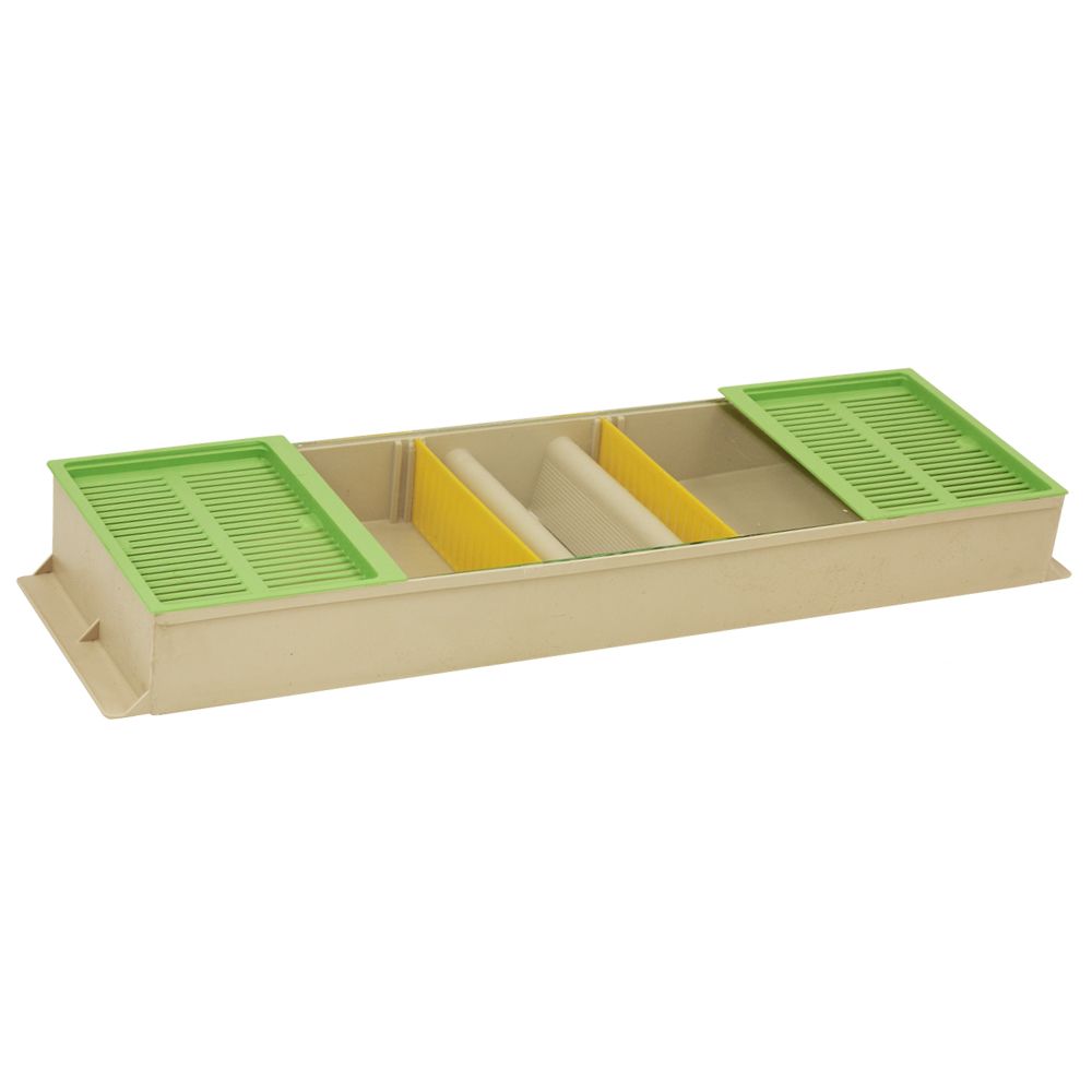 Стельова вона ж надрамкова годівниця виготовляється в Україні із харчового пластику. Перевага використання такого матеріалу полягає в екологічності, адже чим здоровіший бджоли, тим якісніший мед отримує бджоляр. У годівницю на свій розсуд, бджоляр наливає 1.7 літра травневого меду або цукрового сиропу. Її конструкція дозволяє спостерігати рівень корму через скло, а також уникнути потоплення бджіл за рахунок перегородки. Щоб бджоли осушили годівницю, перегородку варто прибрати через час, коли рівень значно знизиться. Встановлюється така годівниця прямо на гніздо, після чого бджоли перенесуть корм у стільники. Розміри годівниці покривають практично повну довжину рамки та дорівнюють 480x137x50 мм.Характеристики
