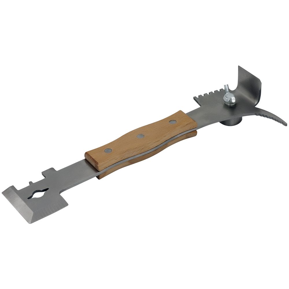 Багатофункціональна стамеска з дерев'яною ручкою зможе замінити вам різноманітний інвентар на пасіці. Дана стамеска крім класичного підхоплення для рамок має зручний гак для поділу рамок, функцію молотка, цвяходеру, сторону для очищення ганеманівських решіток. Стамеска має зручну дерев'яну ручку.• Довжина - 270 мм