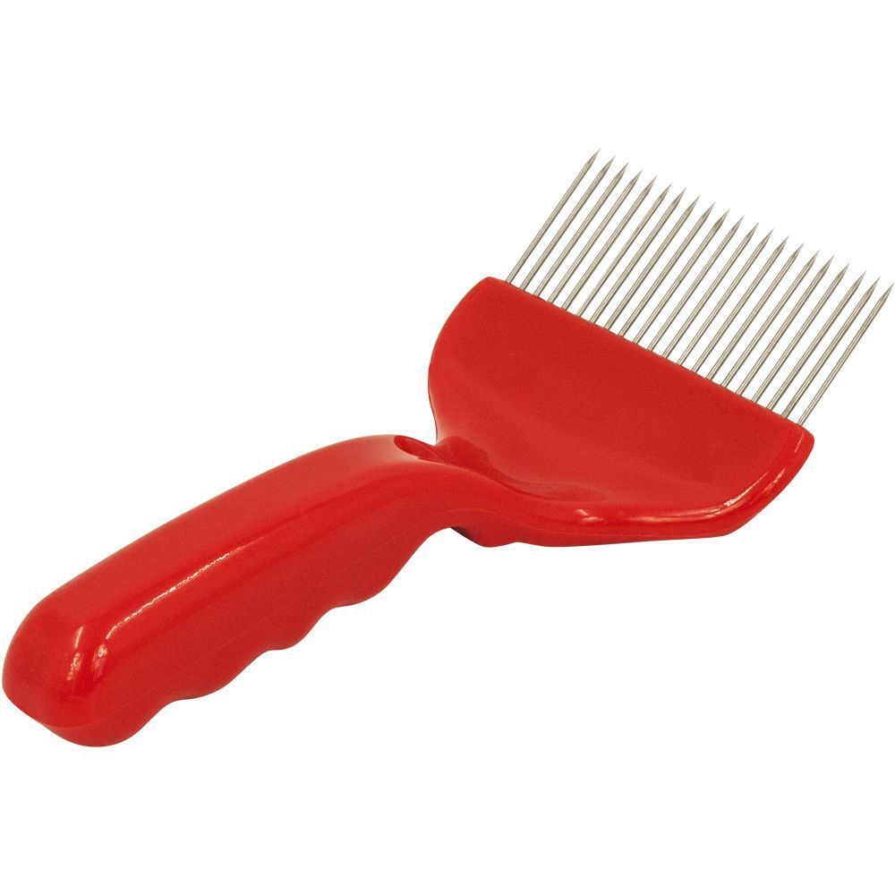 Дана модель вилки для розкриття сот, виконана за класичною схемою, з гострими голками спеціальної прямої форми, основа яких надійно залита в пластик. 21 голка основної робочої частини дозволяє рівномірно і без зусиль розкрити рамки з медом. Ручка вилки виконана з міцного пластику з анатомічною хвилястою формою під пальці в нижній частині, зручно лежить в руці і довго прослужить своєму власнику.