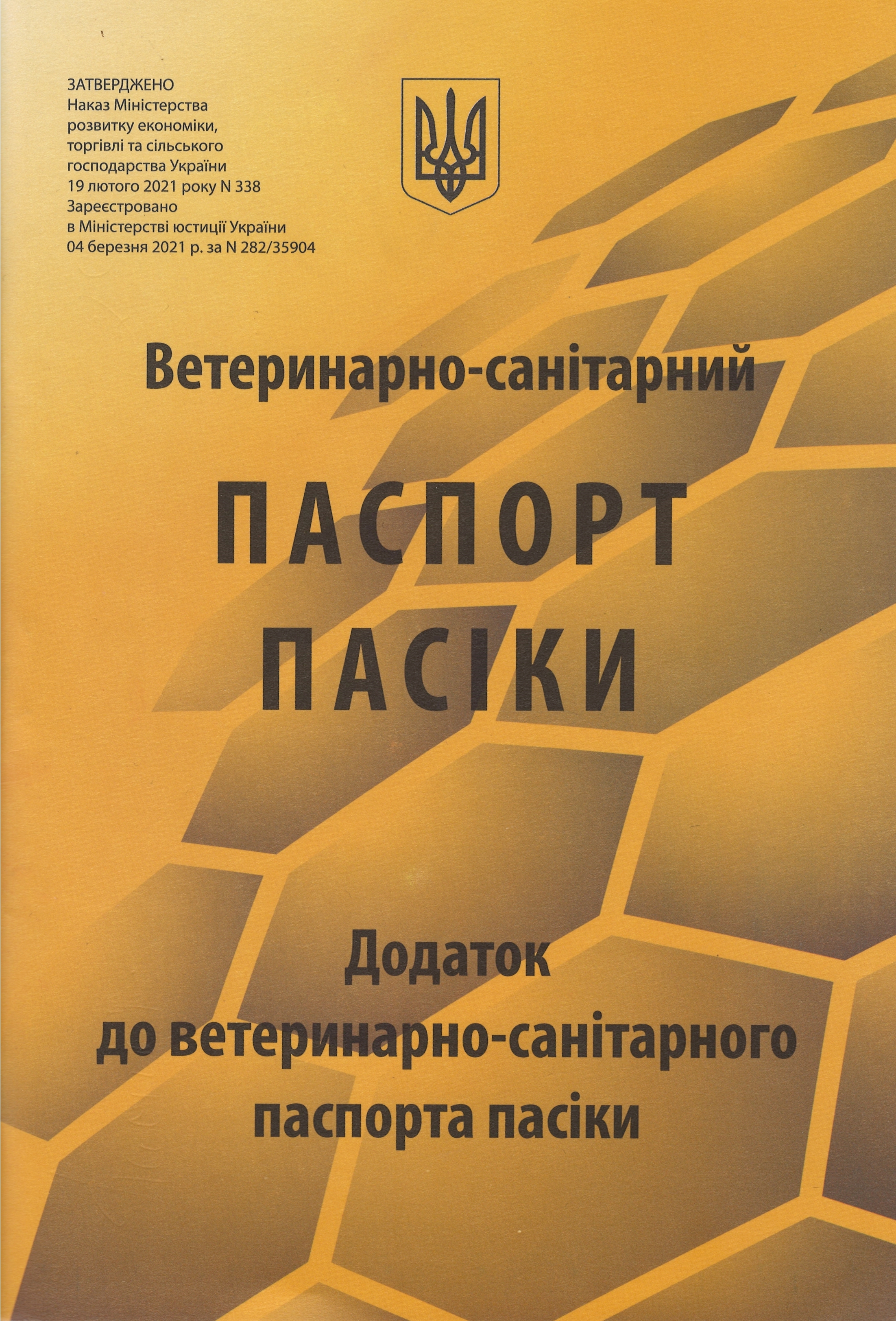 Обновленный Ветеринарно-санитарный паспорт пасеки с Приложением согласно требованиям Приказа Министерства развития экономики, торговли и сельского хозяйства Украины 19 февраля 2021 года N 338. Зарегистрировано в Министерстве юстиции Украины 04 марта 2021 г. за N 282/35904.Паспорт имеет увеличенный формат А4, 96 страниц, белая офсетная бумага, прошит и пронумерован, опломбирован под печать ветслужбы.