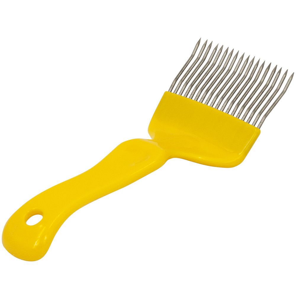 Вилка для распечатывания сот, выполнена по модели классической вилки, с острыми иглами специальной изогнутой формы основание которых надежно запрессовано и залито в пластик. Позволяет равномерно и удобно распечатывать рамку с помощью 18 иголок на основной рабочей части. Ручка вилки выполнена из прочного пластика эргономичной анатомической формы, удобно лежит в руке и долго прослужит своему хозяину. В рукоятке имеется отверстие для возможности разместить на стене подвесив на гвозде, винте или крюке.