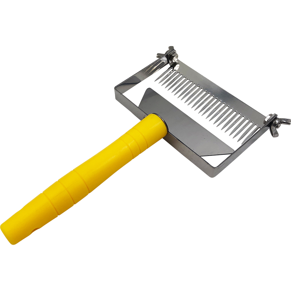 Рабочая часть вилки для раскрытия сот выполнена методом фрезерования из цельного листа нержавеющей стали. Отличительной особенностью данной модели вилки является её ширина – 13 см, что является одним из самых больших размеров для данного типа инструмента и позволит выполнить максимально большой объём работ за минимальный промежуток времени! Конструкция предусматривает возможность регулировать «угол атаки» иголок по отношению к поверности медовой рамки при помощи двух винтов типа «барашек». Рукоятка выполнена из устойчивого, долговечного полимера.