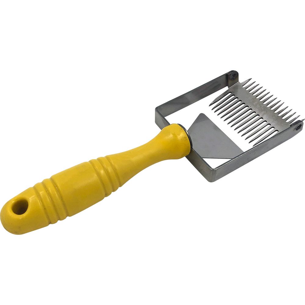 Вилка для распечатывания сот, выполнена по модели вилки-культиватора из прочной нержавеющей стали с очень острыми и заточенными иглами специальной формы. Ее усовершенствованная конструкция позволяет равномерно распечатывать рамку с помощью 16-ти иголок в основной рабочей части, с большой скоростью. На передней части вилки расположены дополнительные 15 игл шириной 60 мм, которые помогают пчеловоду срезать нежелательные наросты или углубления, в которых невозможно произвести вскрытие основной рабочей частью. При распечатывании медовых сот с помощью вилки не нужно нагревать потому, как она изначально имеет продуманную конструкцию. Ручка вилки выполнена из прочного полимера, удобно лежит в руке и долго прослужит своему хозяину. В «хвосте» вилке имеется отверстие для удобного вертикального хранения в подвешенном состоянии – Ваш инструмент всегда будет «под рукой» в нужном месте.