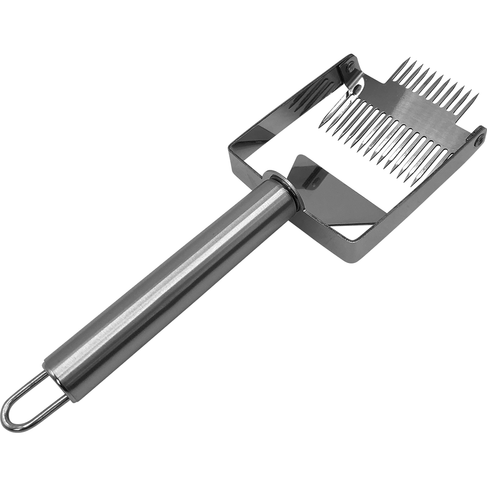 Вилка для распечатывания сот, выполнена по модели вилки-культиватора из прочной нержавеющей стали с очень острыми и заточенными иглами специальной формы. Ее усовершенствованная конструкция позволяет равномерно распечатывать рамку с помощью 17-ти иголок с большой скоростью. На передней части вилки расположены дополнительные 8 игл шириной 40 мм, которые помогают пчеловоду срезать нежелательные наросты или углубления, в которых невозможно произвести вскрытие основной рабочей частью. При распечатывании медовых сот с помощью вилки не нужно нагревать потому, как она изначально имеет продуманную конструкцию. Ручка вилки выполнена из нержавеющей стали, удобно лежит в руке и долго прослужит своему хозяину. В «хвосте» вилке имеется петля для удобного вертикального хранения в подвешенном состоянии.