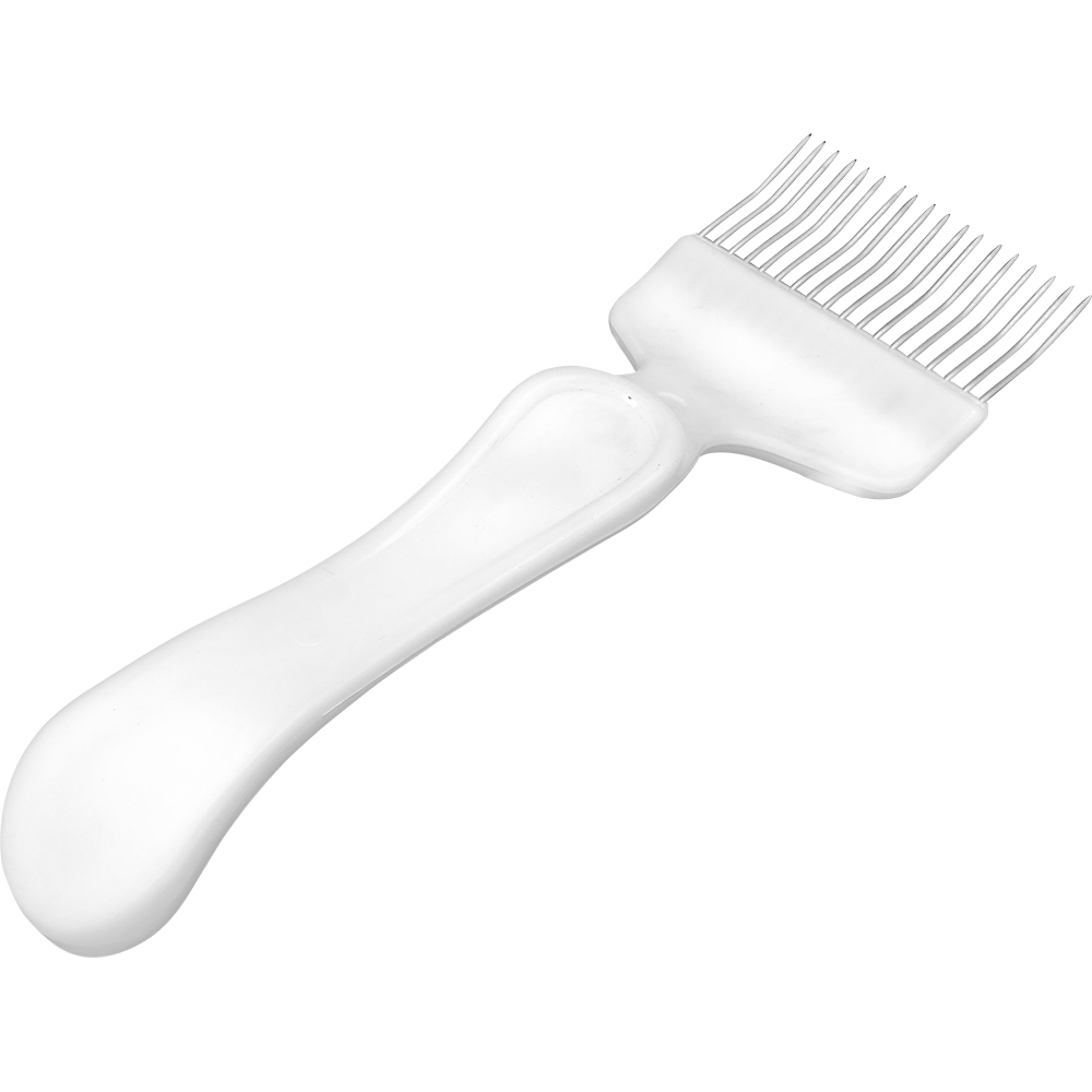 Вилка для распечатывания сот, выполнена по модели классической вилки, с острыми иглами специальной изогнутой формы основание которых надежно залито в пластик. Позволяет равномерно и удобно распечатывать рамку с помощью 18 иголок на основной рабочей части. Ручка вилки выполнена из прочного пластика анатомически изогнутой формы для удобного распожения в руке и долго прослужит своему хозяину. Данная модель вилки имеет небольшой вес – всего лишь 45 грамм, что позволит долго работать не переутомляясь.Методика применения:
