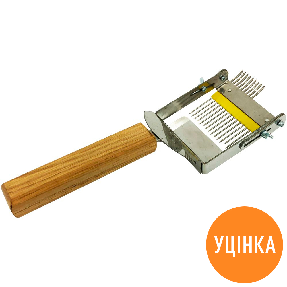 Причина уценки: Отсутствуют болты регулировки наклона.Вилка для распечатывания сот, выполнена по модели вилки-раскладушки из прочной нержавеющей стали марки AISI 304, толщиной – 1.5 мм , с очень острыми и правильно заточенными иглами. Ее усовершенствованная конструкция позволяет равномерно распечатывать рамку с помощью 18 иголок на основной рабочей части и 9 иголок в передней части для доступа и вскрытия сот в труднодоступных местах.